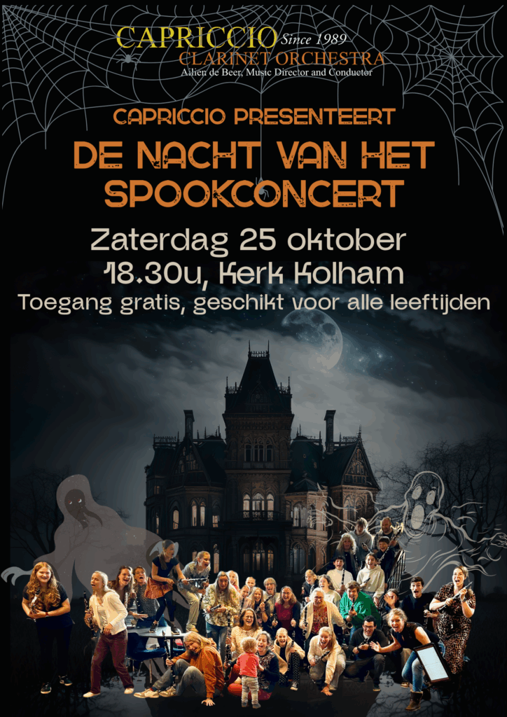 Een muzikaal griezelverhaal voor de allerjongsten jong tot heel heel heel oud. Spannende achtervolgingen, dansende geesten, raadselachtige pompoenen, dappere helden. Kom verkleed, griezel mee en laat je betoveren door dit spookachtig concert.
